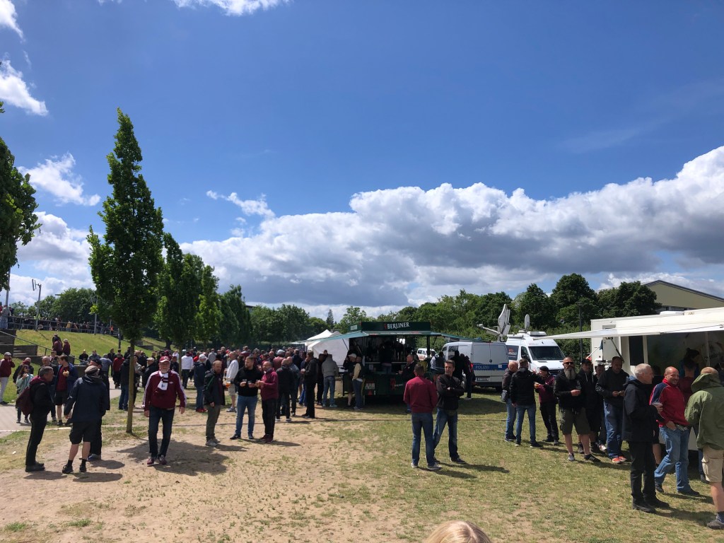 Krzesełka znajdują się tylko po jednej stronie boiska na trybunie, którą umownie możemy nazwać główną, bo jest tam nawet kawałek dachu wyznaczający dość prowizoryczną strefę dla VIP-ów. Podczas samego meczu tuż za nią ustawiono kilka mobilnych punktów gastronomicznych, ale serce tej części stadionu biło przede wszystkim w restauracji z ogródkiem, która pracowała na pełnych obrotach przez całe spotkanie. Nasyp uniemożliwiał podglądanie sytuacji na boisku, ale nikomu to przesadnie nie przeszkadzało. Znalezienie wolnego stolika graniczyło z cudem. Definicja Fussbalkultur. Bo przecież tak naprawdę w całej tej zabawie to, co dzieje się na boisku nie jest aż tak ważne. Piłkarzy można sobie pooglądać w telewizji. I to znacznie lepszych.