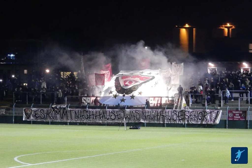 Po trzecie kibicowsko. Doping, oprawy i szeroko pojęte aspekty klimatu ultras nigdy nie były mocną stroną kibiców BFC Dynamo. Od zawsze kibicowało się tutaj bardziej w brytyjskim stylu, bo trzon trybun stanowią panowie po 40., 50., czy nawet 60. urodzinach. Emerytowani chuligani bez tzw. talentu wokalnego. Ale przez ponad dekadę na meczach aktywnie działała grupa Ultras BFC, która miała za zadanie nieco zaktywizować młodsze pokolenie – zajmując się zorganizowanym dopingiem i choreografiami. W ostatnich miesiącach – oczywiście na miarę potencjału oraz możliwości – załoga Ultras BFC były bardzo aktywna i jeszcze podczas styczniowego spotkania z SV Lichtenberg 47 zaprezentowała oprawę nawiązującą do odzyskania przez klub praw do historycznego herbu. Jej motywem przewodnim było hasło Es kommt nach hause, was nach hause gehört!, czyli To, co należy do domu, wraca do domu!