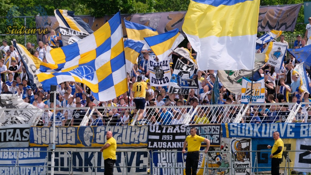 Zdecydowanie głośniejsi byli więc kibice Carl Zeiss Jena, którzy szczelnie, w kilkaset osób, wypełnili sektor gości. Ekipa z Jeny to zresztą ścisła czołówka byłej NRD, jeśli chodzi o doping i oprawy. Fani Carl Zeiss dopingują we włoskim stylu, zawsze są świetnie oflagowani (zarówno na płotach, jak i trybunach, gdzie obok dużych flag na kijach są też te znacznie mniejsze na dwóch). Daje to super efekt wizualny.