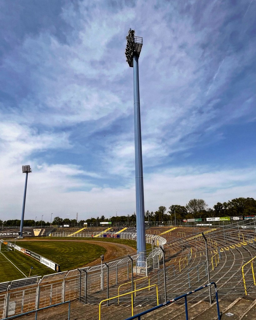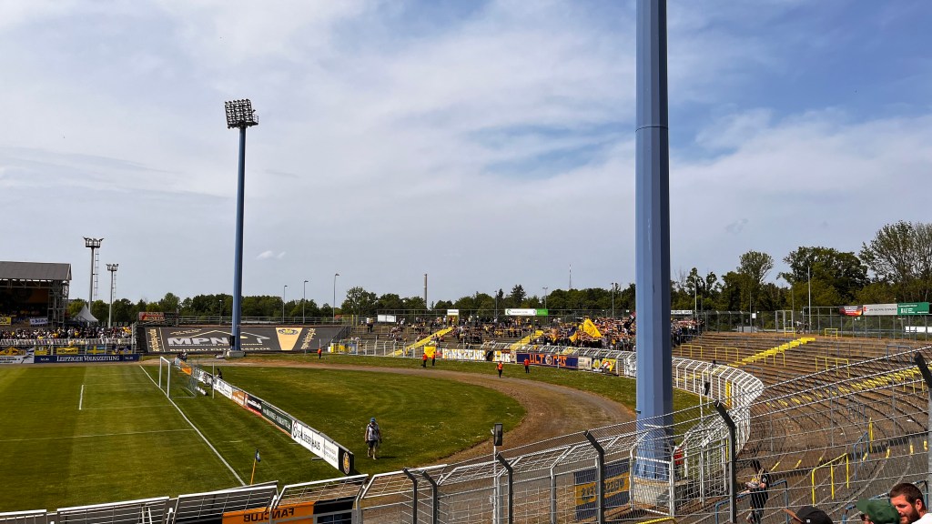 Większość stadionu to natomiast tylko i wyłącznie miejsca stojące poprzecinane co kilka rzędów barierkami. Na barierkach oczywiście setki vlepek, a nad całym tym inwentarzem górują strzeliste jupitery w starym stylu. Jeśli dodamy do tego jeszcze tę drewnianą trybunę, to w klimacie Bruno-Plache-Stadion naprawdę można się zakochać. Takich miejsc nie ma już wiele. Tutaj czas zatrzymał się co najmniej dwie dekady temu.