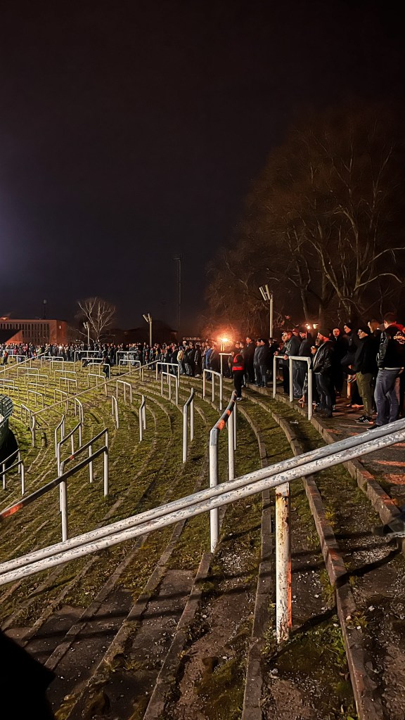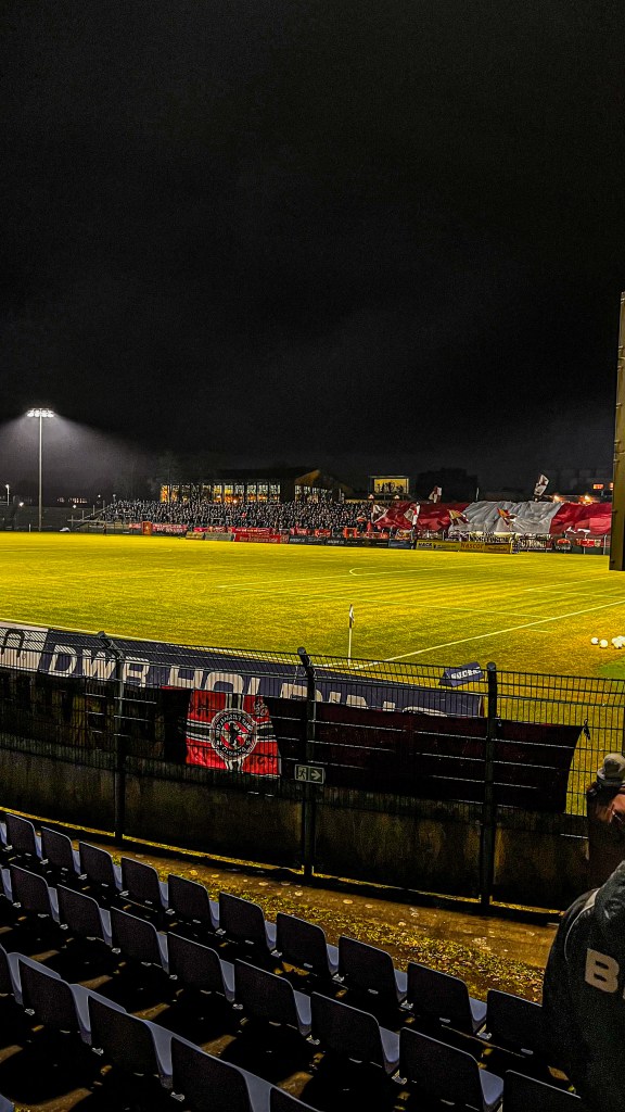 I choć była to już moja enta wizyta na meczu BFC, to dopiero pierwsza przy sztucznym oświetleniu i nie mam wątpliwości, że w erze nowoczesnych stadionów przypominających multipleksy, niewiele jest już tak klimatycznych obrazków, jak wypełnione do ostatniego miejsca, archaiczne Sportforum Hohenschönhausen skąpane w blasku jupiterów.